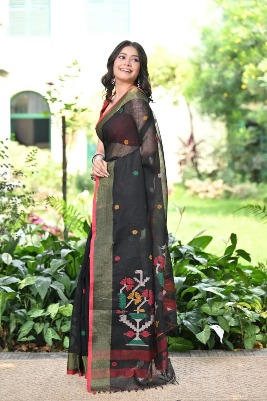 Handloom Dark Green Pure Linen Zari Jamdani Saree
