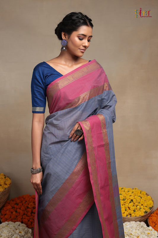 Handloom Grey Pure Cotton Kanchi Saree With Rouge Pink Border