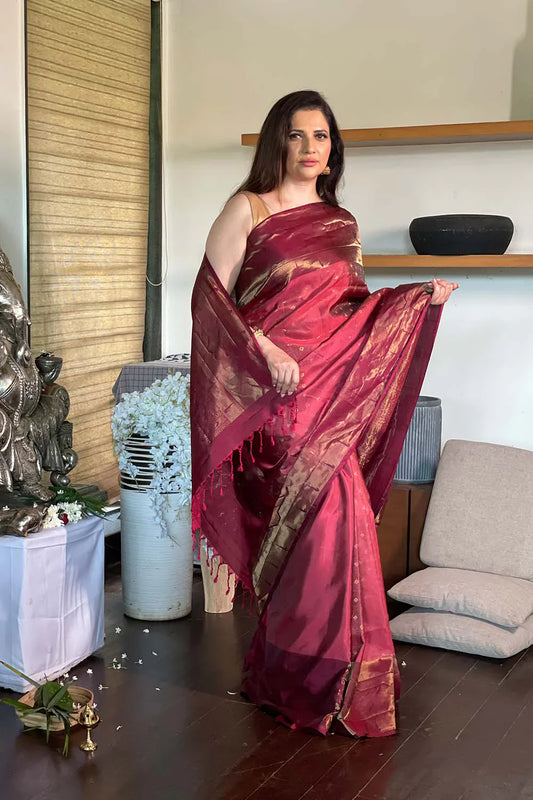 Handloom Wine Pure Cotton Saree With Gold Zari Border & Pallu