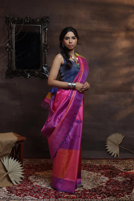Handloom Pink Pure Silk Saree With Multi Colour Pallu