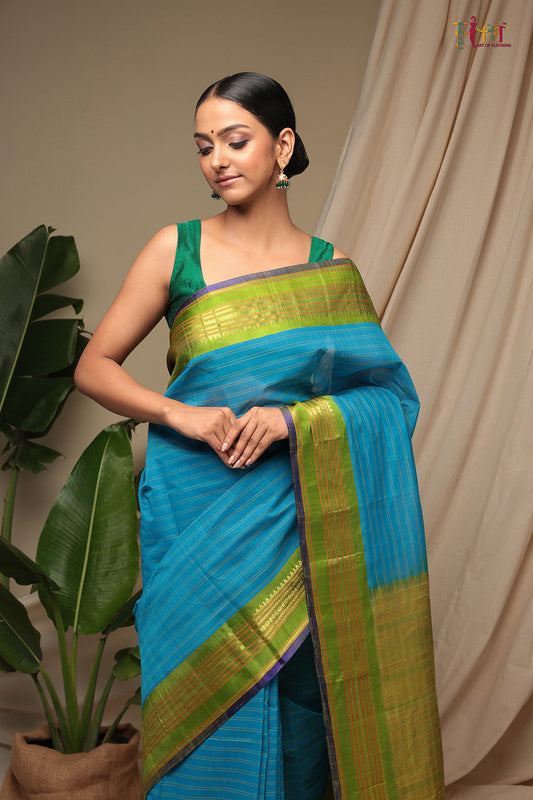 Handloom Ocean Blue Pure Cotton Kanchi Saree With Pure Silk Border And Pallu