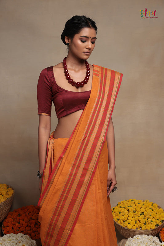 Handloom Atomic Orange Pure Cotton Kanchi Saree