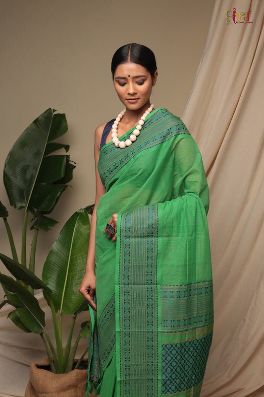 Handloom Parrot Green Pure Cotton Kanchi Saree With Generous Border
