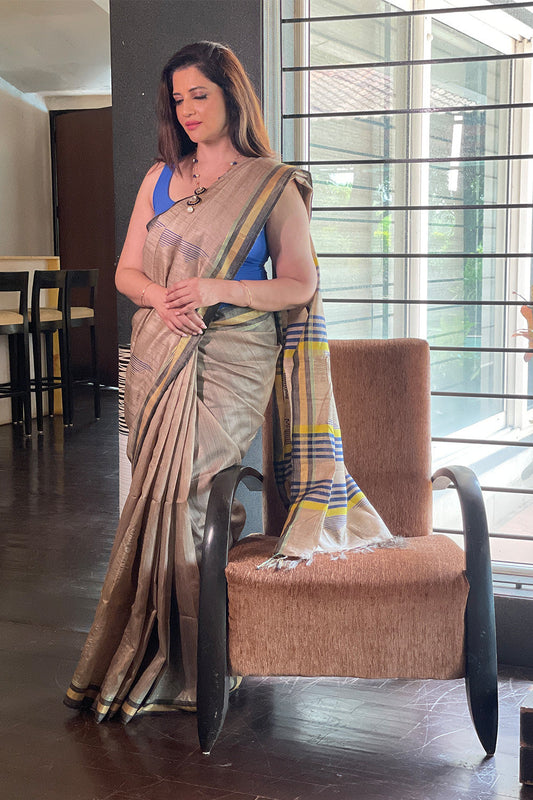 Beige Handloom Tussar Silk Saree Woven With Multi Colour Pallu