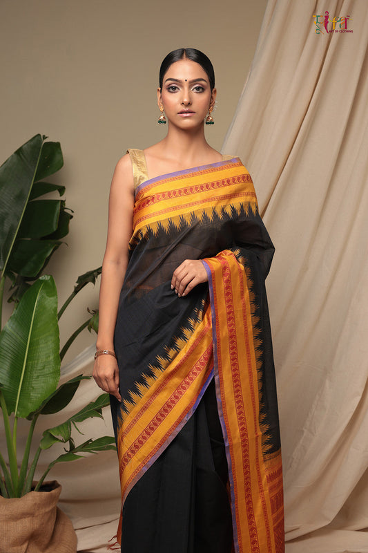 Handloom Black Pure Cotton Kanchi Saree With Pure Silk Mustard Border And Pallu