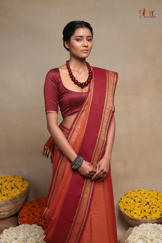 Handloom Orange & Red Pure Cotton Kanchi Saree