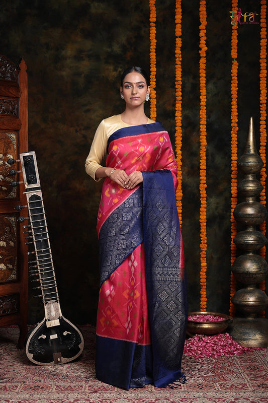 Rose Pink Pure Silk Pochampally Saree With Navy Blue Silver Zari Border