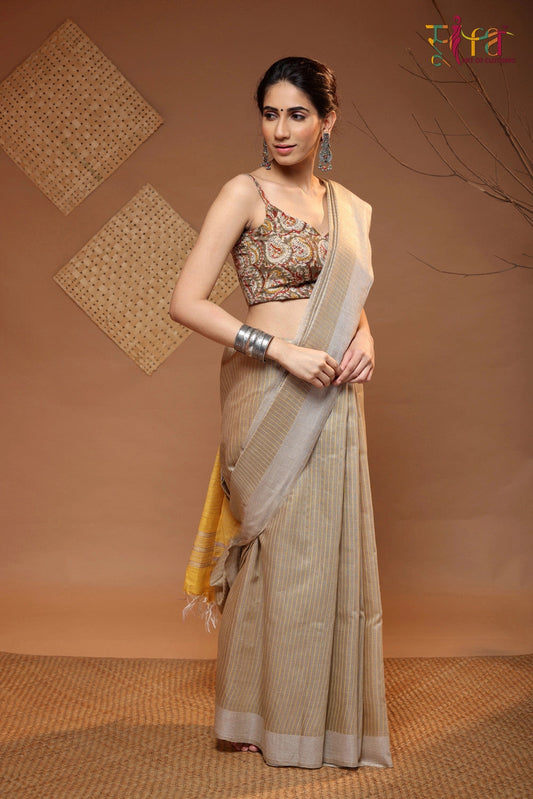 Handloom Beige Tussar Muga Silk Saree With Yellow Stripes