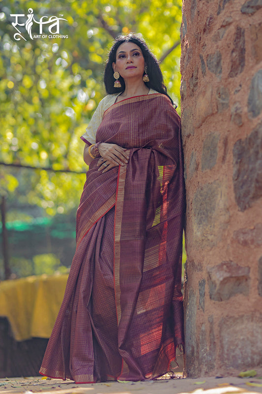 Handloom Maroon Bhagalpur Silk Saree With Gold Zari Checks