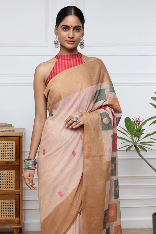 Handloom Brown Soft Cotton Jamdani with Multi Colour Box Motifs Saree