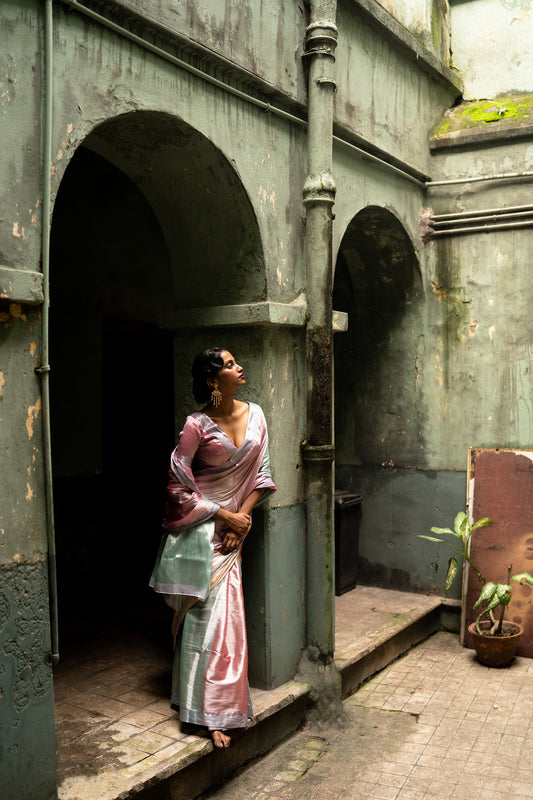 Her Majesty I Pastel Pink Handwoven Mulberry silk tissue saree