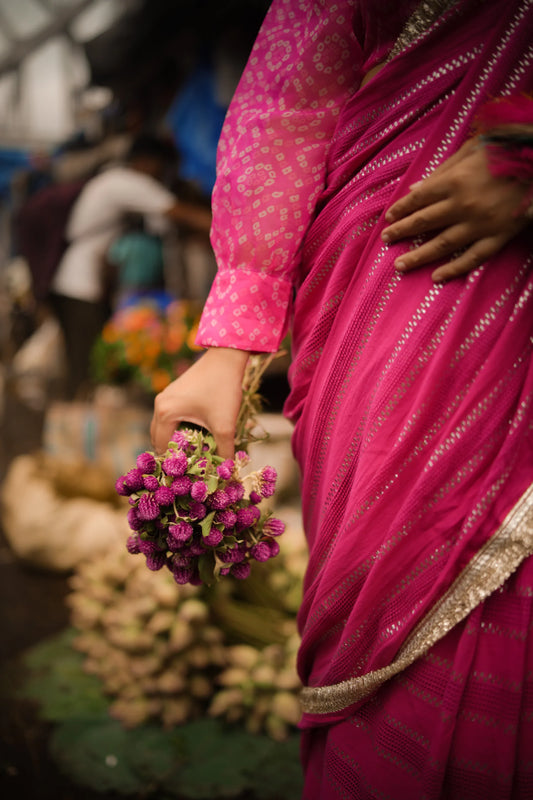 Bengal's Pride Premium Hand Woven Jangla Jaal Work Cotton Dhakai Jamdani Saree in Off White, Black, Amber, Taffy Pink and Hot Pink Thread Work