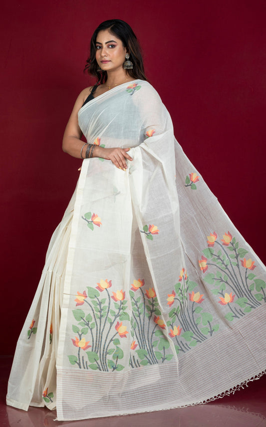 Premium Quality Hand Work Cotton Dhakai Jamdani Saree in Vista White and Multicolored Thread Work
