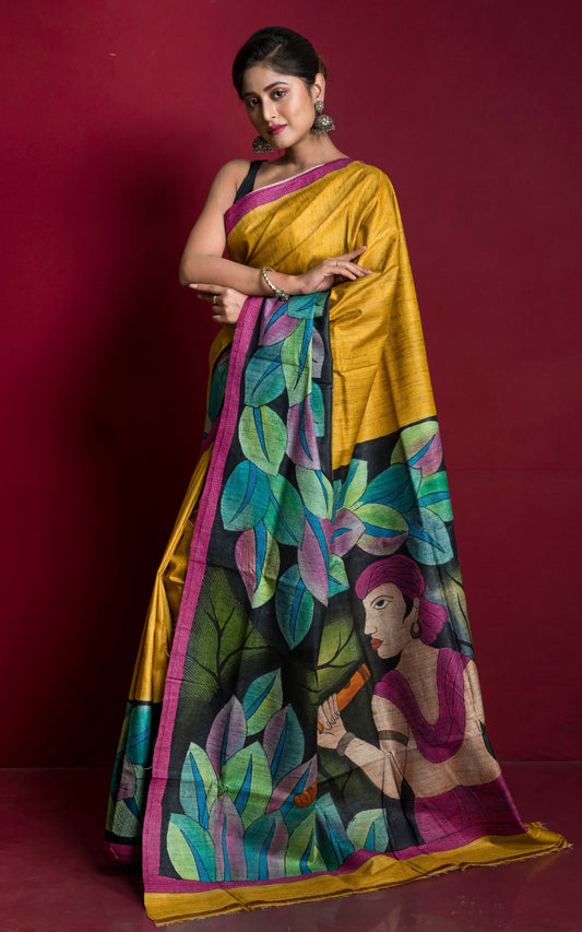 Hand Painted and Hand Embroidery Work Tussar Silk Kantha Work Saree in Golden Yellow, Black and Multicolored
