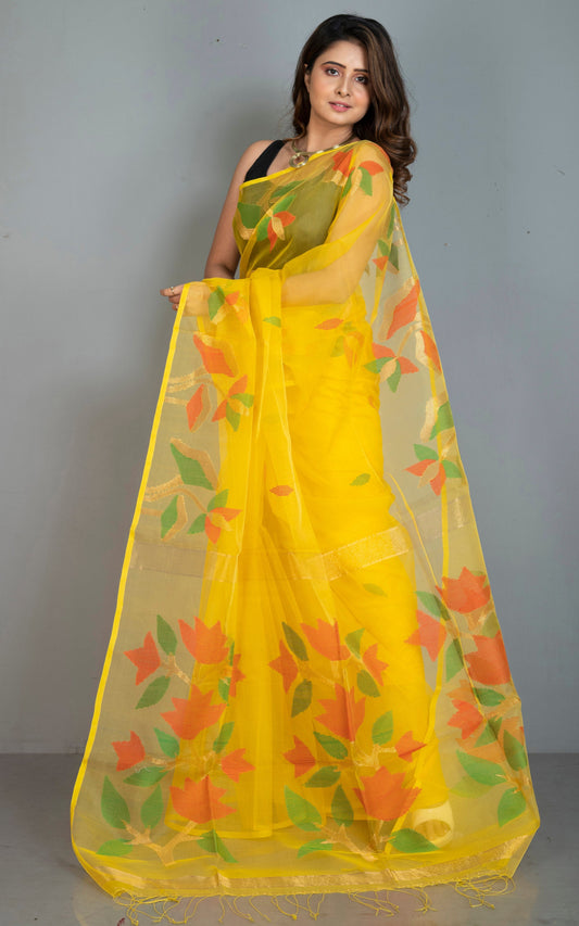 Naal Phool Woven Nakshi Work Muslin Silk Jamdani Saree in Bright Yellow, Red, Green and Gold Zari Work