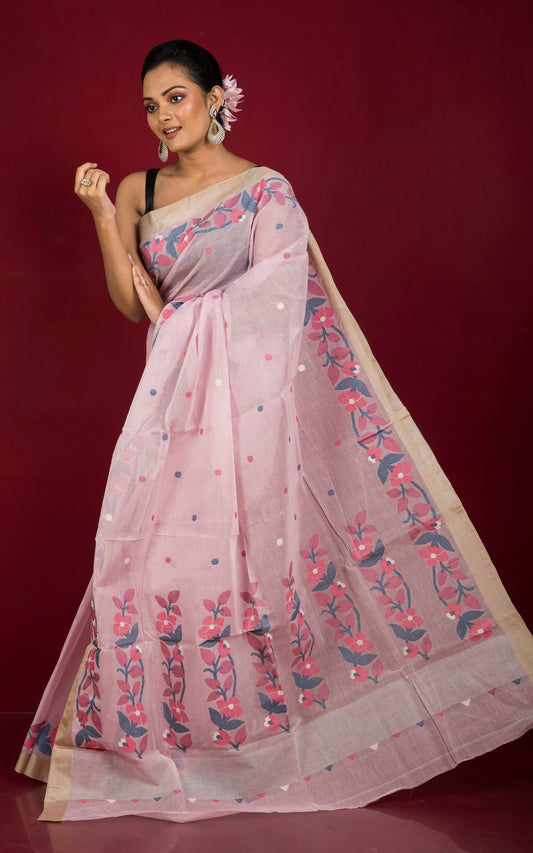 Premium Quality Hand Work Cotton Dhakai Jamdani Saree in Carnation Pink and Multicolored Thread Work