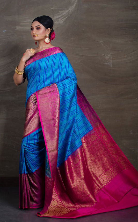 Pure Dupion Tussar Banarasi Saree in Blue and Rani