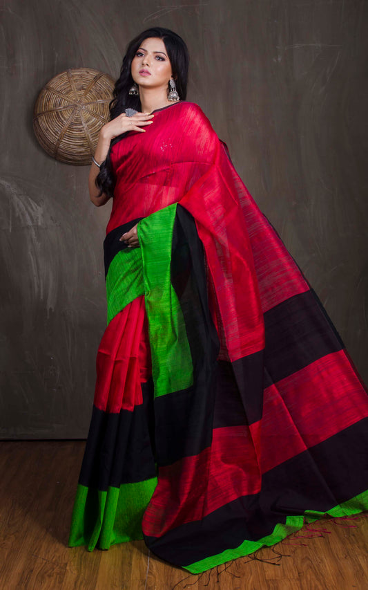 Premium Matka Tussar Saree with Skirt Border in Red, Black and Green