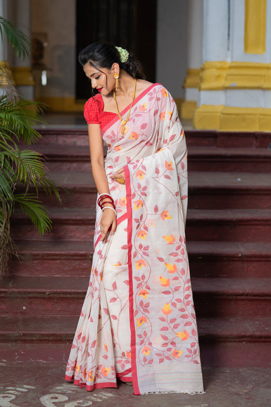 Handloom White & Red Pure Cotton Floral Motifs Jamdani Saree