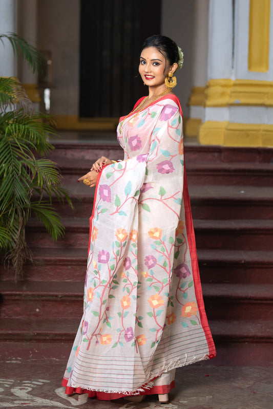 Handloom White & Red Pure Cotton Multi Colour Floral Motifs Jamdani Saree
