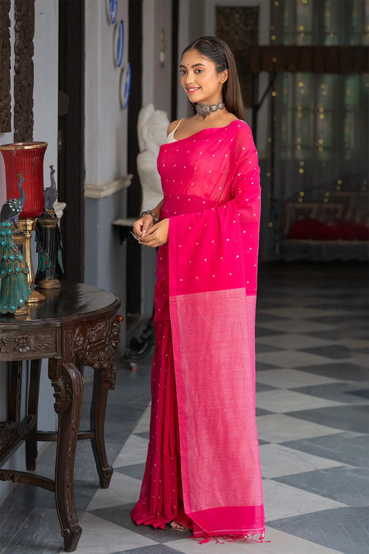 Handloom Pink Pure Cotton Polka Jamdani Saree