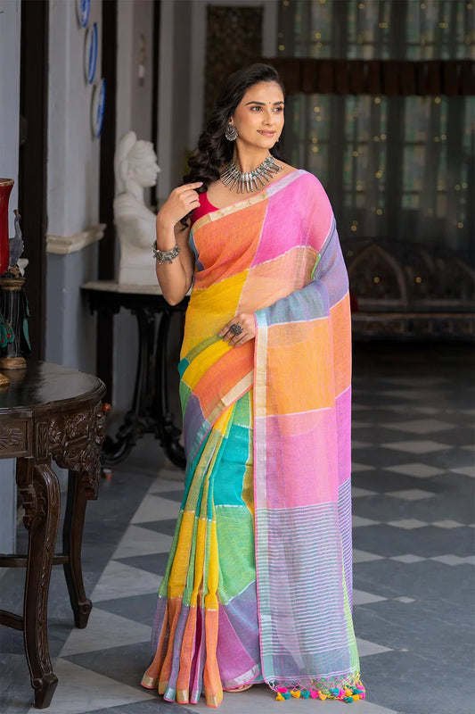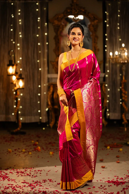 Handloom Hot Pink Pure Silk Banarasi Saree with Yellow Border