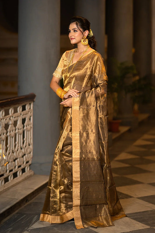 Handloom Copper Brown Pure Tissue Silk Chanderi Saree