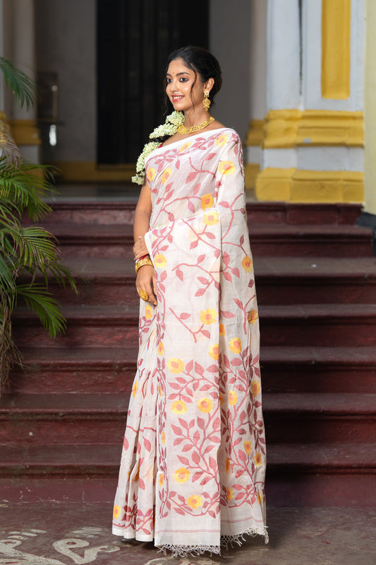 Handloom White & Red Pure Cotton Yellow Floral Motifs Jamdani Saree