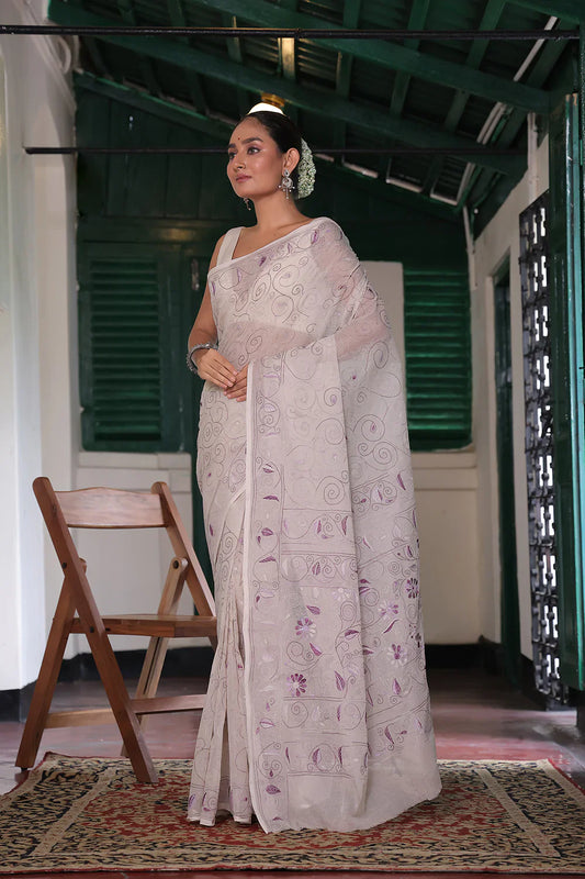 Handloom Off White Pure Cotton Kantha Saree