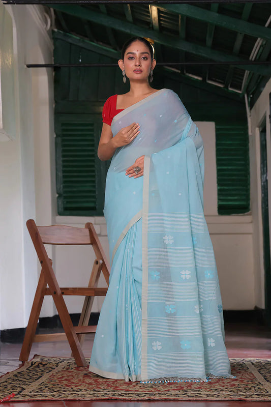 Handloom Sky Blue Soft Cotton Jamdani Saree