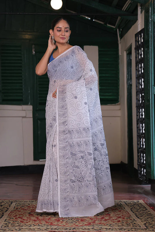 Handloom White & Grey Pure Cotton Kantha Saree