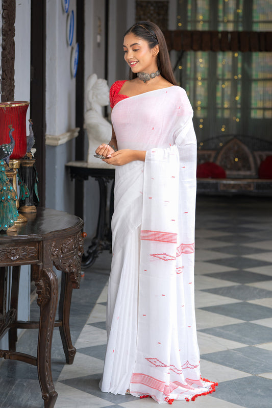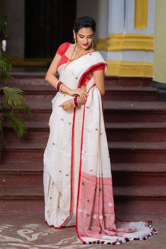 Handloom White Pure Linen Jamdani Saree with Red Polka dots