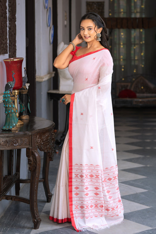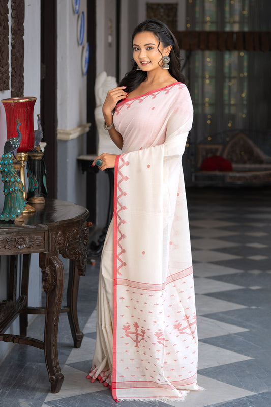 Handloom Off White Pure Cotton Laal Paar Jamdani Saree with Polka Motifs