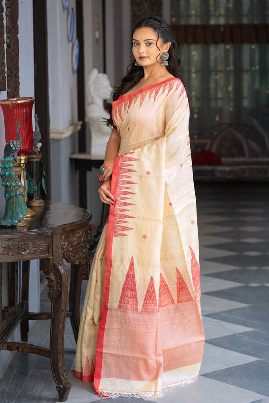 Handloom Beige & Red Pure Tussar Silk Jamdani Saree