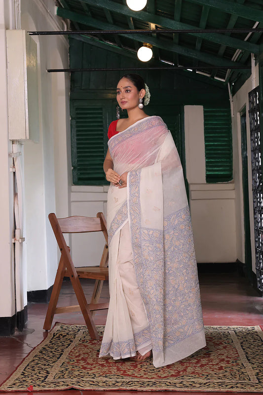 Handloom Off White Pure Cotton Blue Floral Kantha Saree