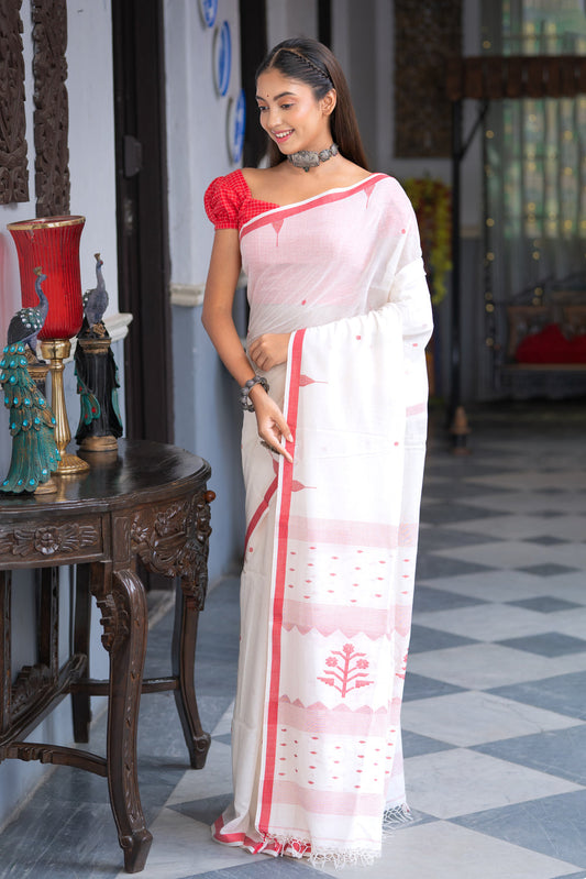 Handloom White Pure Cotton Laal Paar Jamdani Saree