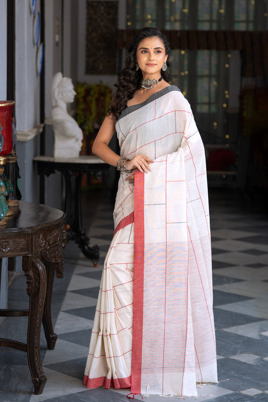 Handloom Off White Soft Cotton Brick Check Saree