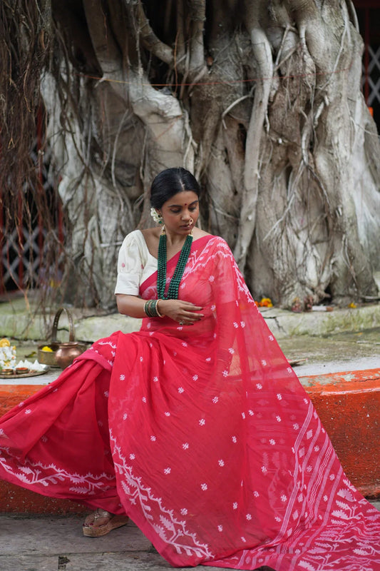 Handloom Red Pujo Jamdani Saree