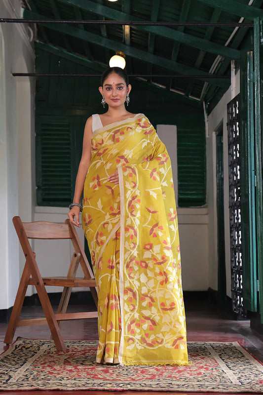Handloom Amber Yellow Pure Cotton Jamdani Saree with Floral Motifs