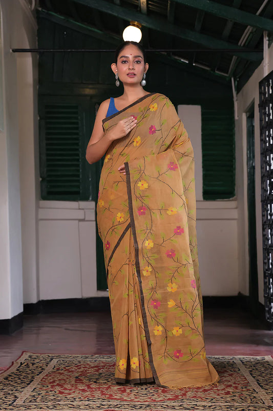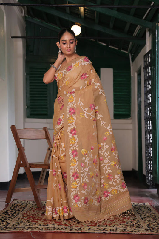 Handloom Camel Beige Pure Cotton Jamdani Sareewith Floral Motifs