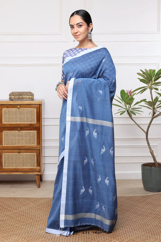 Handloom Blue Mulmul Cotton Mayur Jamdani Saree