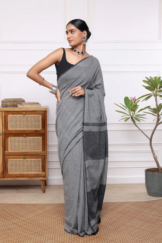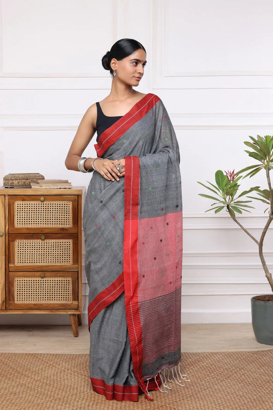 Handloom Grey Pure Cotton Jamdani Saree with Poka Dot Motifs