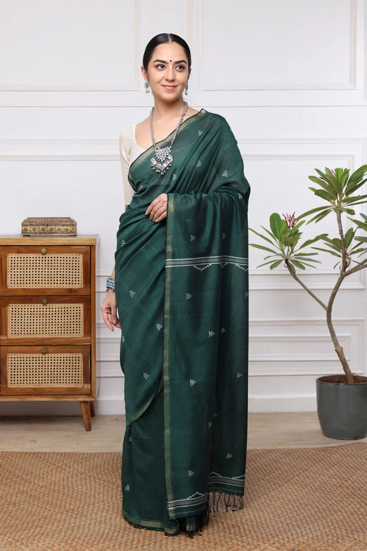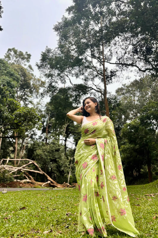 Handloom Basil Green Mulmul Cotton Jamdani Saree