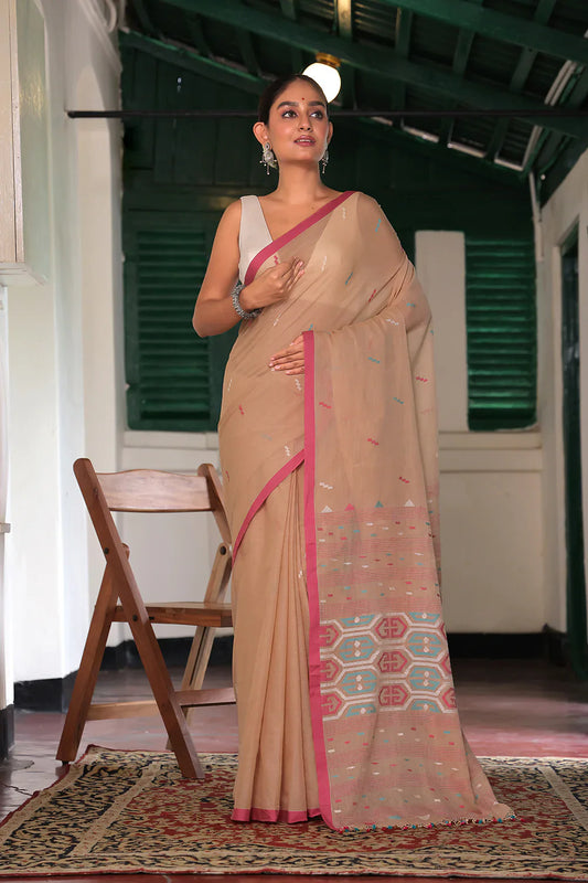 Handloom Cookie Brown Soft Cotton Jamdani Saree
