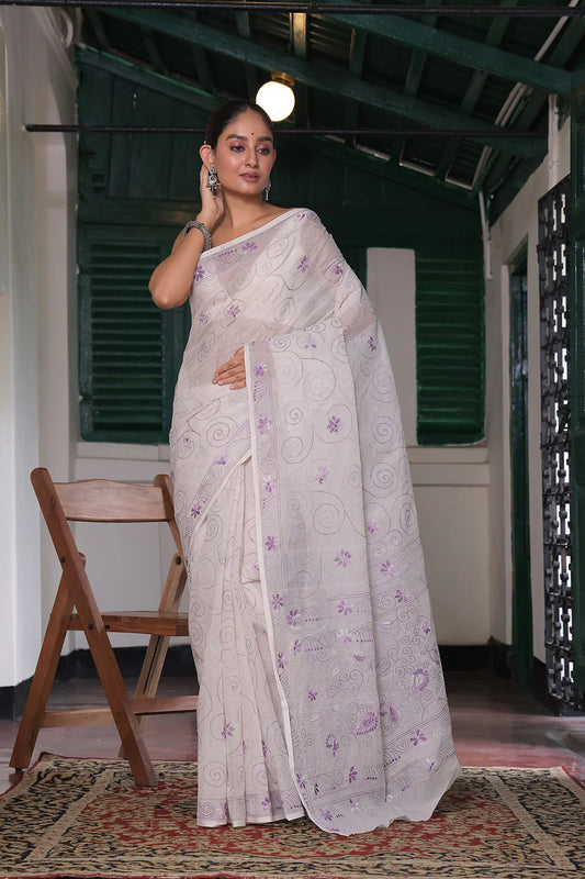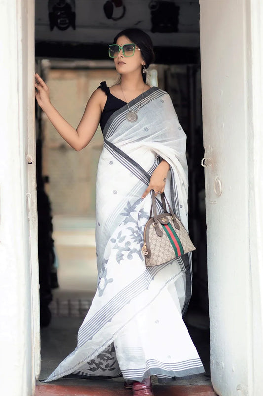 Handloom Black & White Pure Cotton Jamdani Saree with Floral Motifs