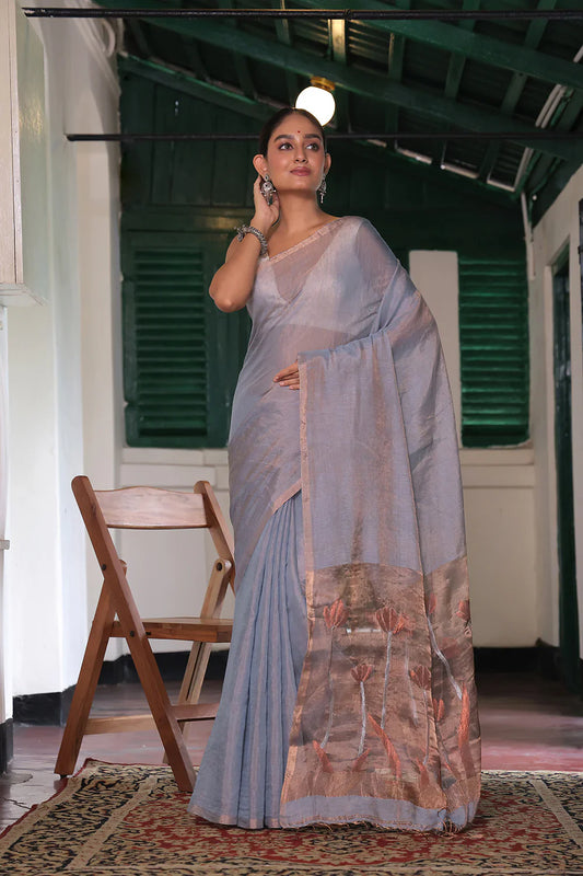 Handloom Grey Tissue Linen Saree with Gold Zari Tulip Pallu