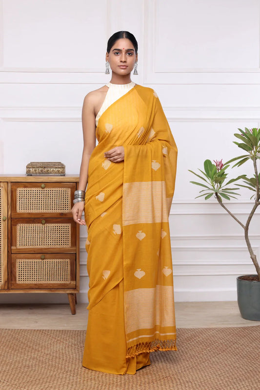 Handloom Saffron Yellow Mul Cotton Jamdani Saree