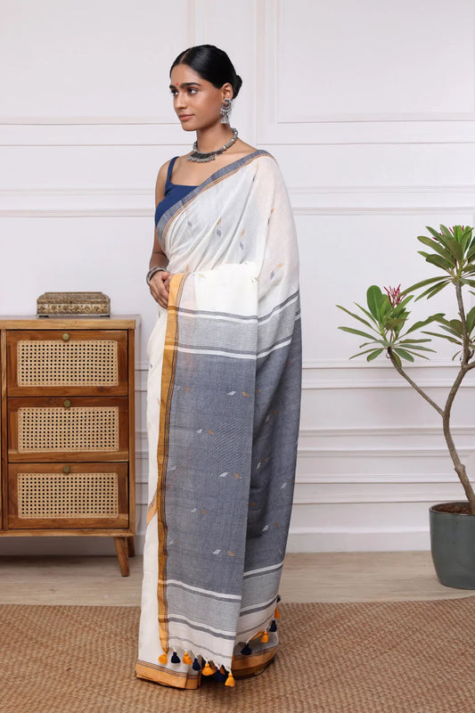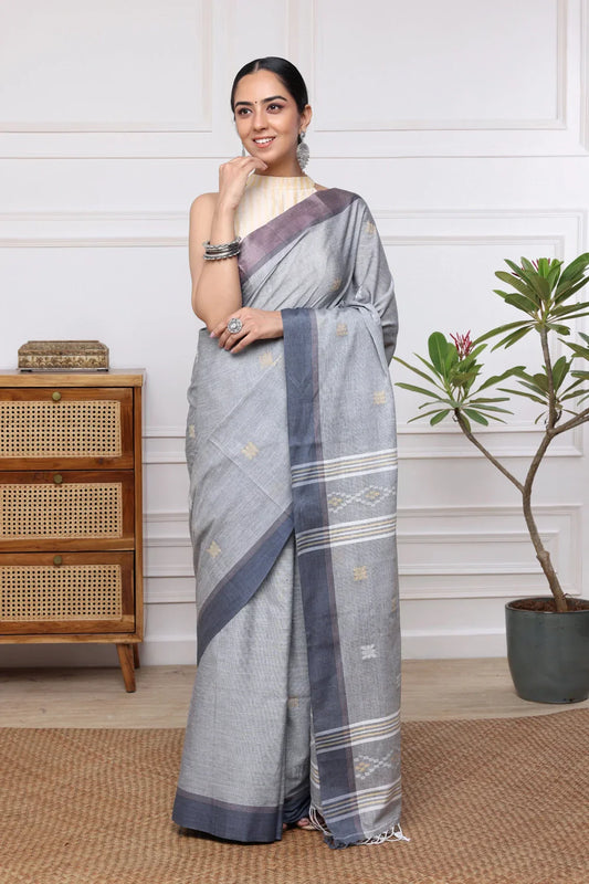 Handloom Grey Mul Cotton Jamdani Saree