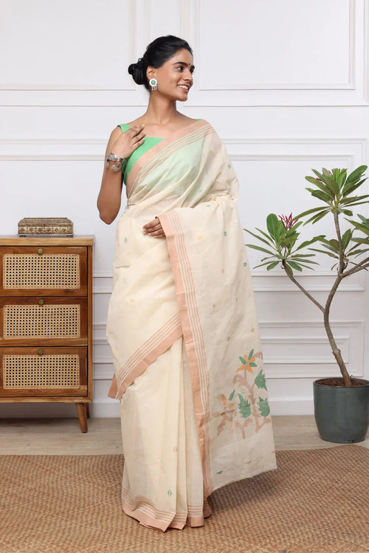 Handloom Cream Pure Cotton Jamdani Saree with Mustard Border