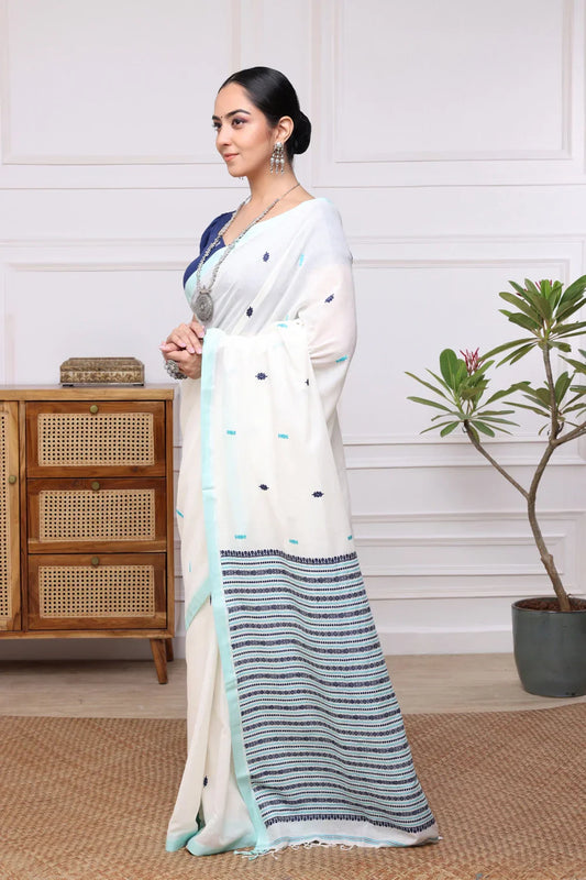 Handloom Pure Cotton White Saree With Aqua Green Border